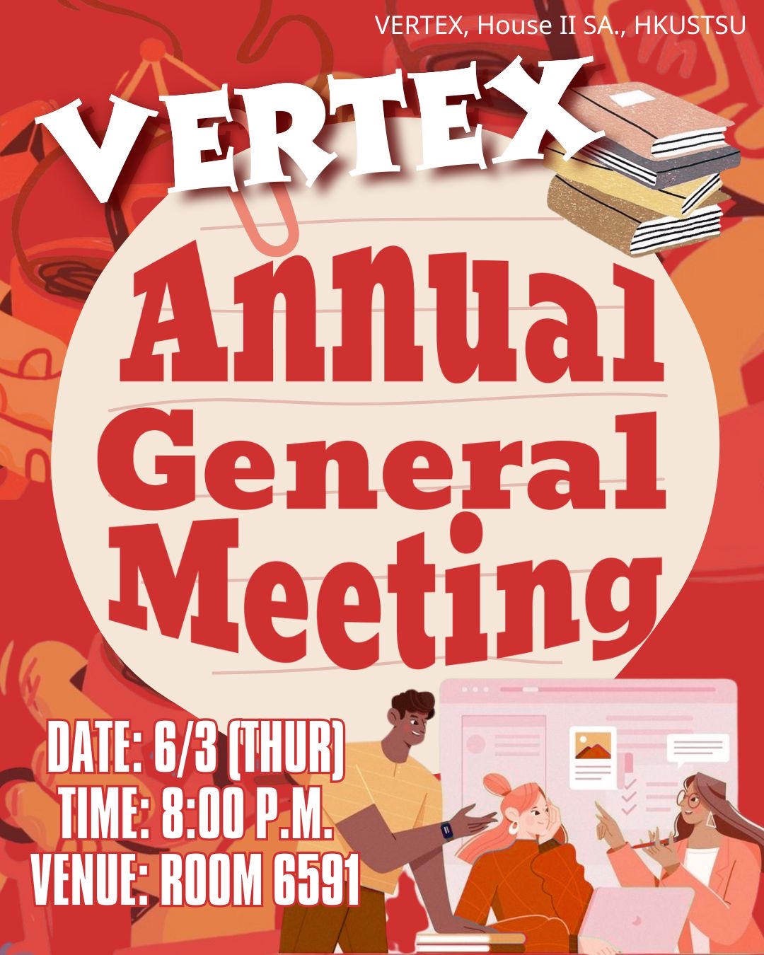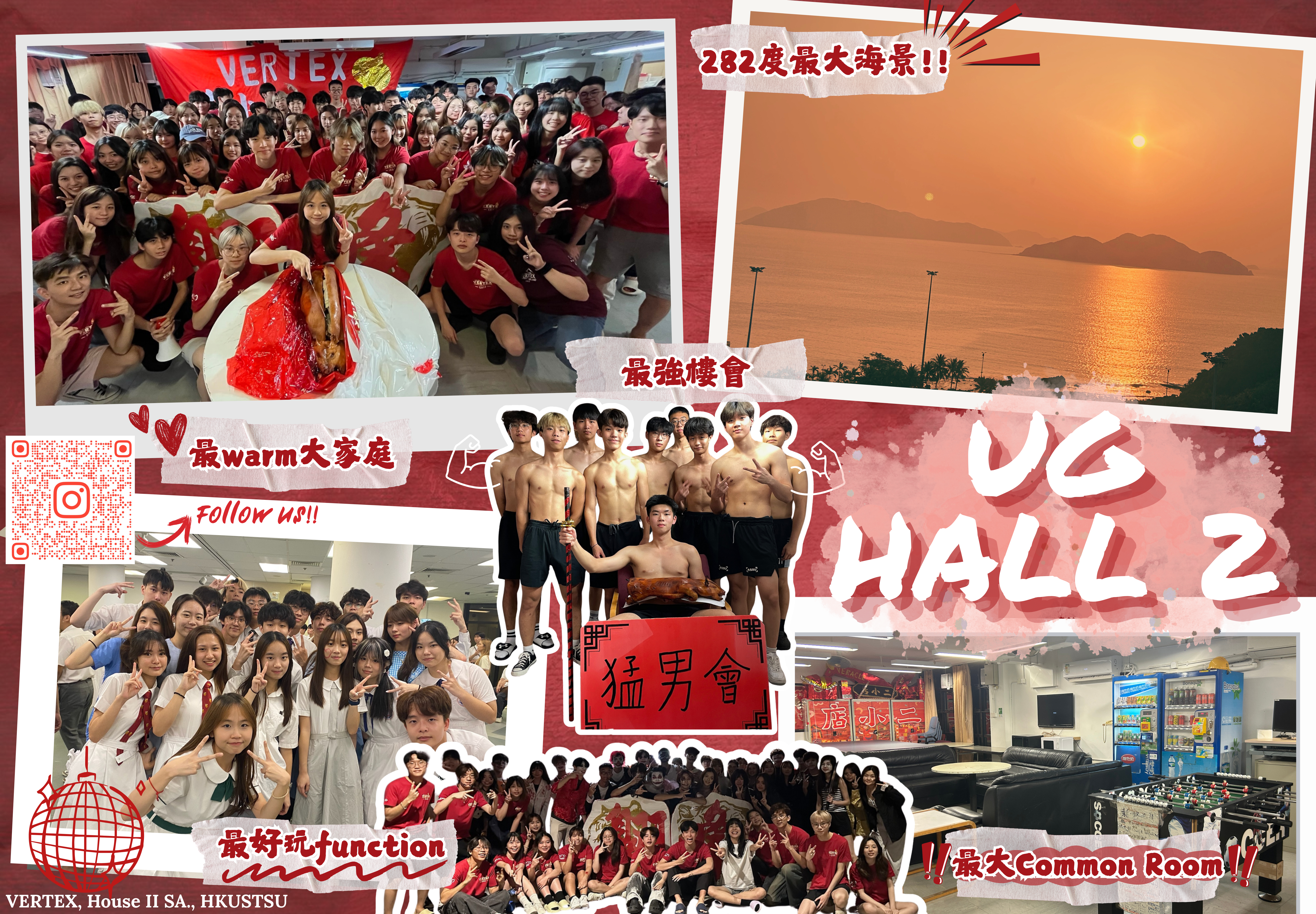 VERTEX, House II Students' Association, HKUSTSU (VERTEX, House II SA., HKUSTSU) was founded with the opening of UG Hall II in Feb, 1993. The name “VERTEX" denotes that we strive for the best for House II in every aspect at all times. VERTEX, House II SA., HKUSTSU is one of the affiliated societies of HKUST Students' Union with the base in UG Hall II.